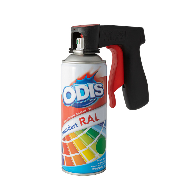 Пистолетный держатель для аэрозольных баллонов ODIS Ds1110 - приспособление многократного использования, предназначенное для установки на баллончик с краской, клеем, лаком, очистителем и других видов аэрозольной продукции, с целью обеспечения удобства работы и комфортного распыления (нанесения краски, лаков и т. п. материалов).