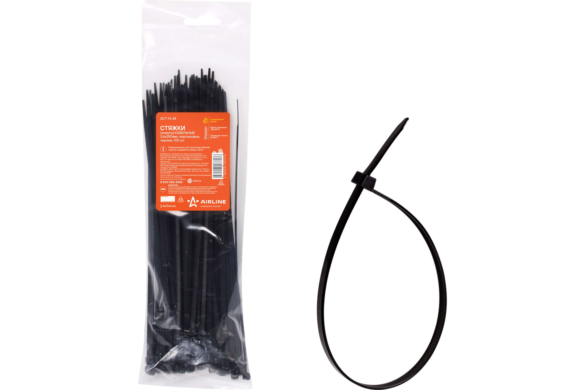 Хомут нейлоновый 3,6x250мм чёрный AIRLINE ACT-N-24 (упак 100шт)