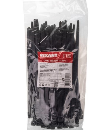 Хомут нейлоновый 7,6x200мм черный 07-0203 REXANT (упаковка 100шт)